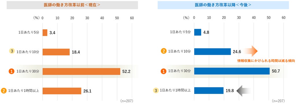 医師が情報収集にかけられる時間は医師の働き方改革以前(調査時点)と今後を比較したところ、