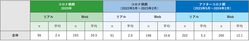 平均参加回数は、アフターコロナになりリアル講演会が2.9から5.3と倍近く伸びたものの、Web講演会は