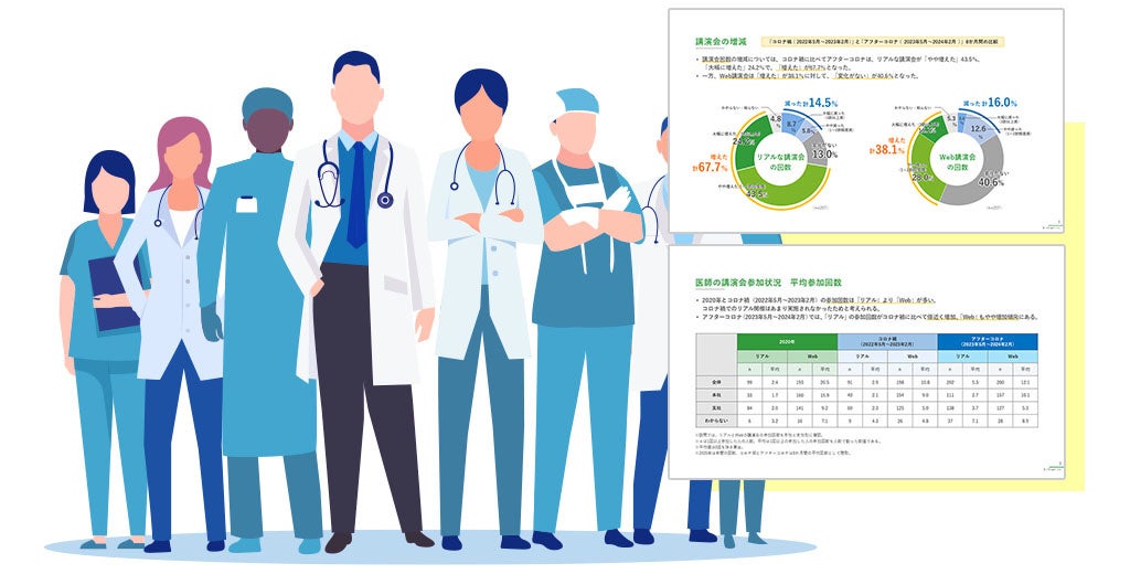 今回の調査では、まん延防止等重点措置の終了後のコロナ禍期(2022年5月~2023年2月)と、5類感染症指定後のアフターコロナ期(2023年5月~2024年2月)の比較を行い、本格的なアフターコロナ期における製薬会社主催の講演会への参加状況、今後に向けての課題の抽出を行いました。また、2024年4月1日に「医師の働き方改革」に関する法律が施行され、労働時間の短縮を柱とする対応が求められる中での、講演会や医師による情報収集のあり方についても課題の抽出を行ったものです。