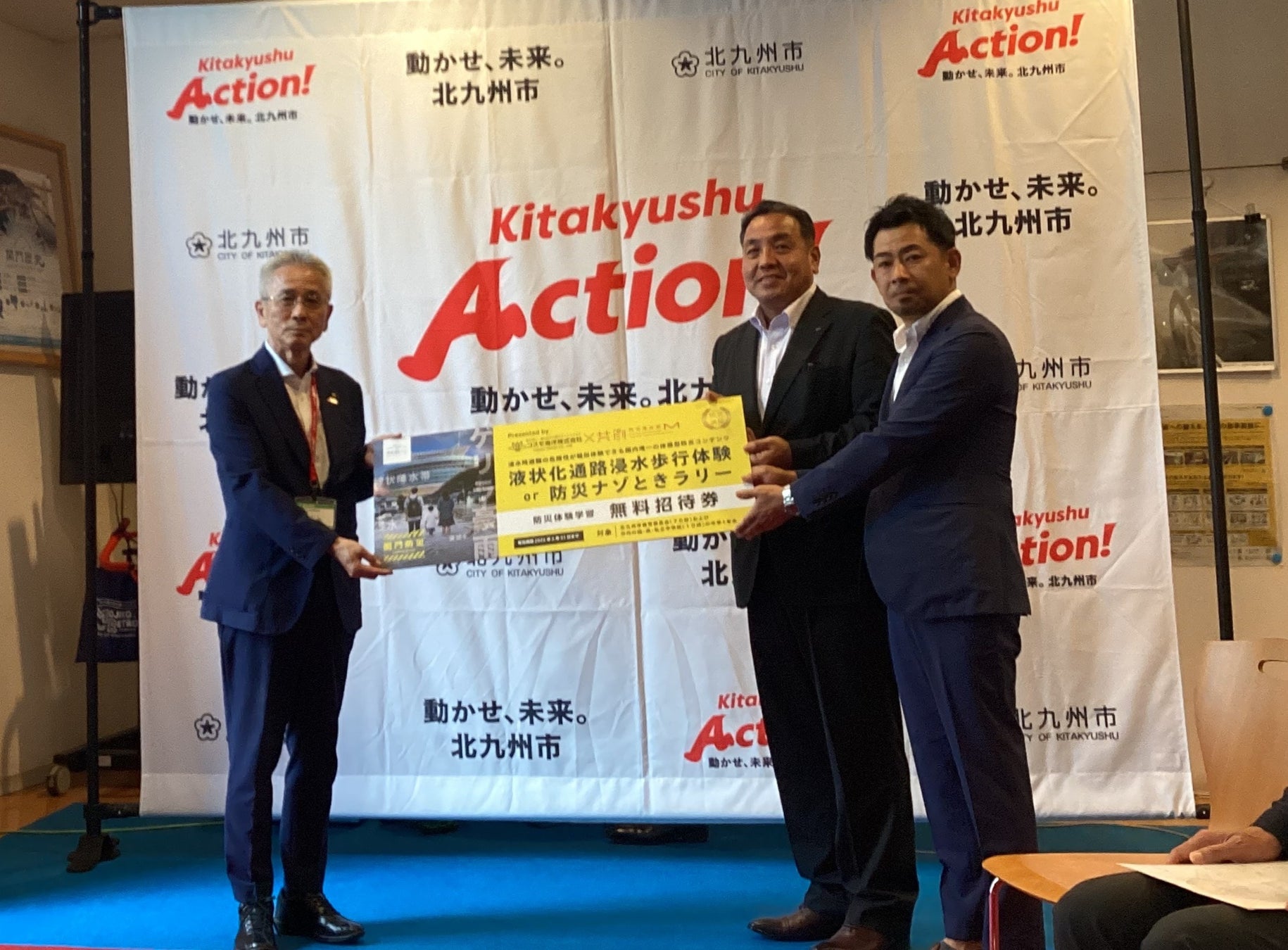 7月10日(木)、関門海峡ミュージアム1階防災ブースにて「液状化通路浸水歩行体験」利用招待券を寄贈いたしました。招待券については、北九州市教育委員会(70校)および市内の国・県・私立中学校(10校)の中学1年生を対象にご利用いただくこととなっております。