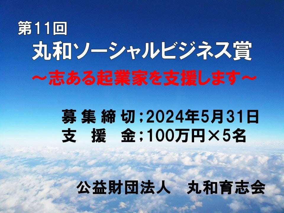 公益財団法人丸和育志会(東京都杉並区、理事長:橋本 忠夫)は、志と富のバランス=社会貢献とそれに必要な利を追求しようとする起業家を支援し、“自分で考え、仲間をつくり、実践する”経営者の育成を図るため、2024年4月1日(月)から5月31日(金)まで第11回丸和ソーシャルビジネス賞を募集します。応募者には事業計画策定の知的支援もあり、受賞者(5名)にはひとり100万円が給付されます。
