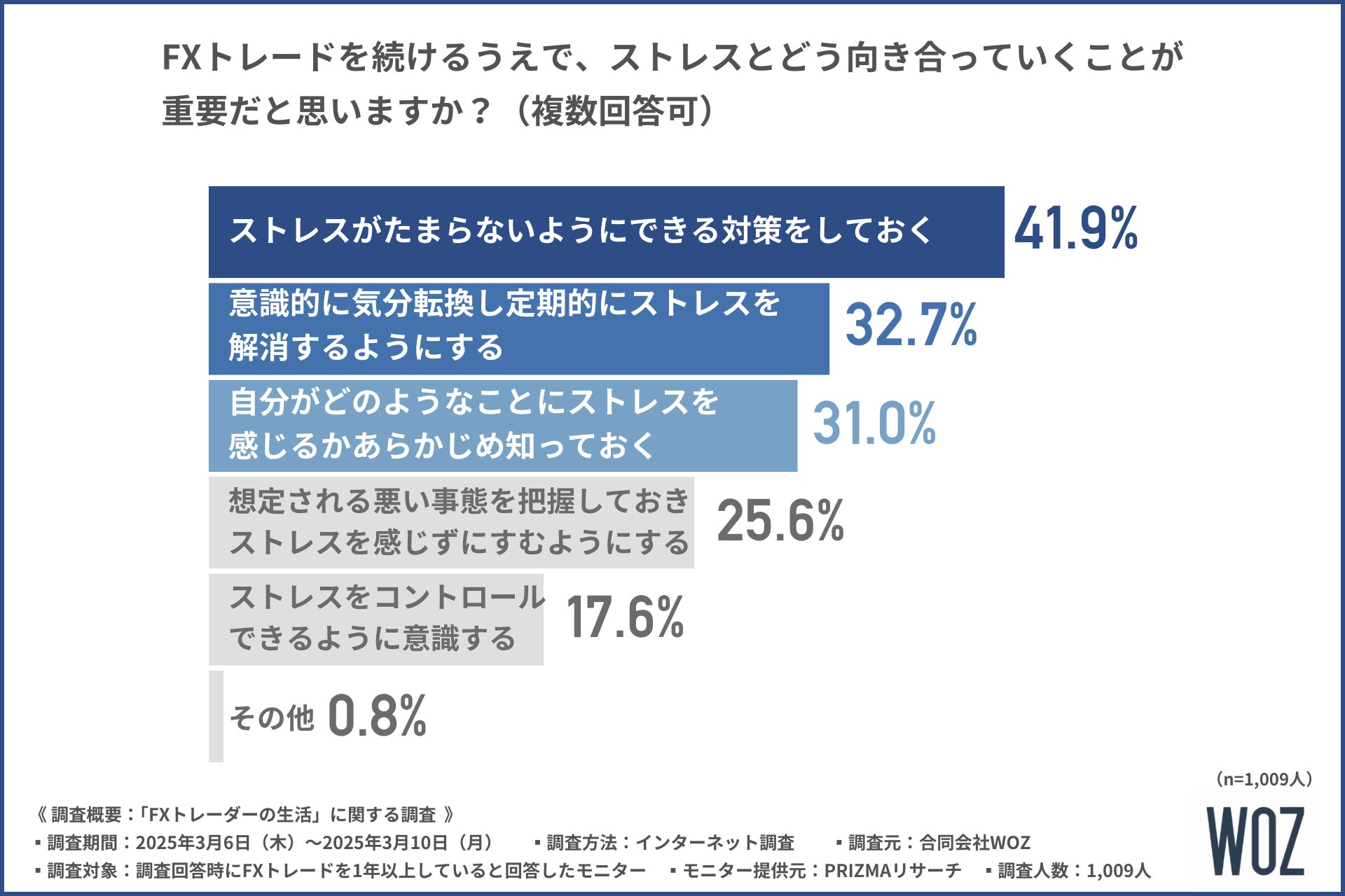 「FXトレードを続けるうえで、ストレスとどう向き合っていくことが重要だと思いますか?(複数回答可)」と質問したところ、『ストレスがたまらないようにできる対策をしておく(41.9%)』と回答した方が最も多く、次いで『意識的に気分転換し定期的にストレスを解消するようにする(32.7%)』『自分がどのようなことにストレスを感じるかあらかじめ知っておく(31.0%)』となりました。