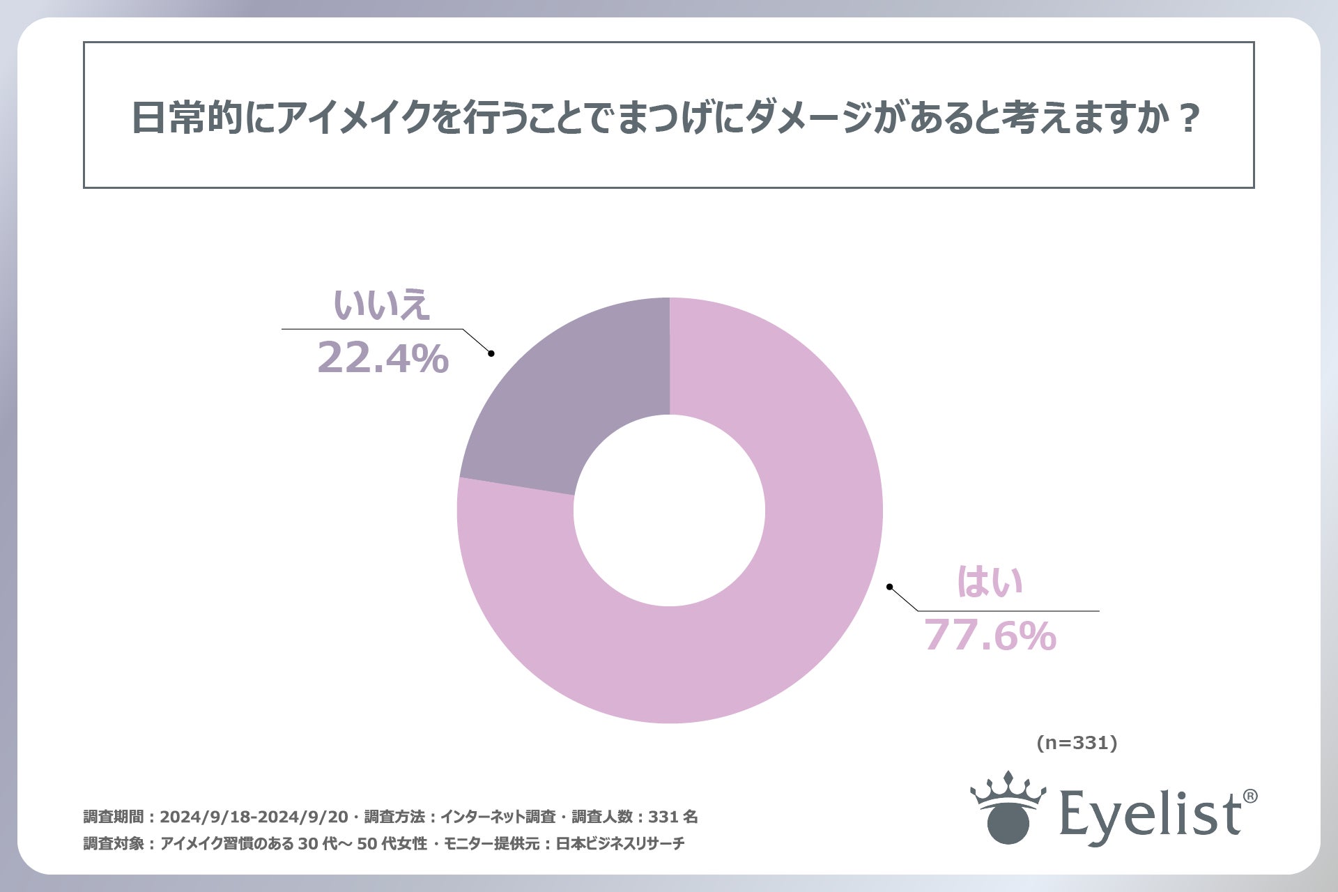 まず、「日常的にアイメイクを行うことでまつげにダメージがあるか」という設問に対しては、「はい」と回答した方が77.6%でした。この結果から、アイメイク習慣のある30代~50代女性の7割以上が、アイメイクによってまつげにダメージがあると感じていることがわかりました。