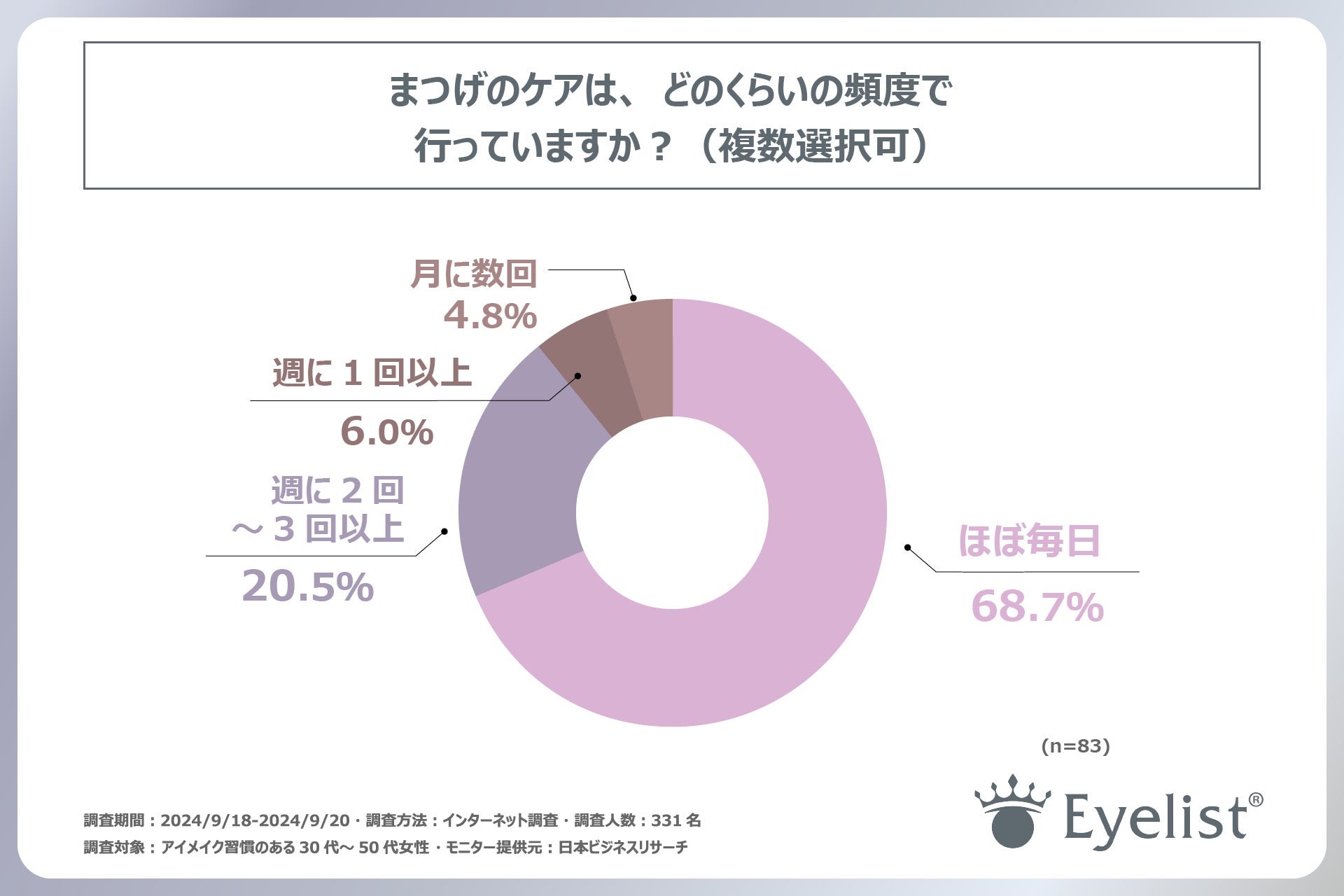 調査の最後に「まつげのケアはどのくらいの頻度で行っているか」という設問では、最も多い回答が「ほぼ毎日」で68.7%でした。次いで「週に2回~3回以上」が20.5%、「週に1回以上」が6.0%という結果となりました。この結果から、まつげケアを日常的に行っている方の内約7割の方がほぼ毎日まつげケアを行っていることがわかりました。