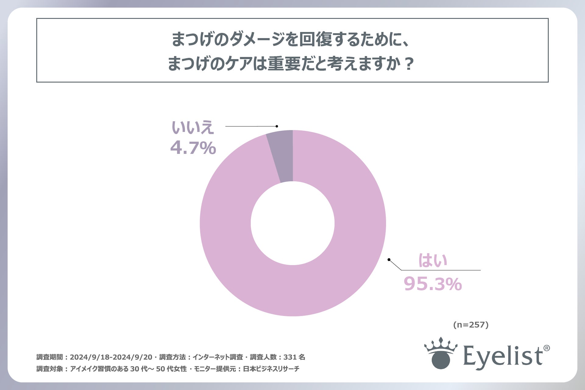 続いてアイメイクでまつげにダメージがあると回答された方に「まつげのダメージを回復するために、まつげのケアは重要だと考えるか」という設問に対して、「はい」と回答した方が95.3%でした。この結果から、大半の方がまつげのケアが重要だと考えていることがわかりました。
