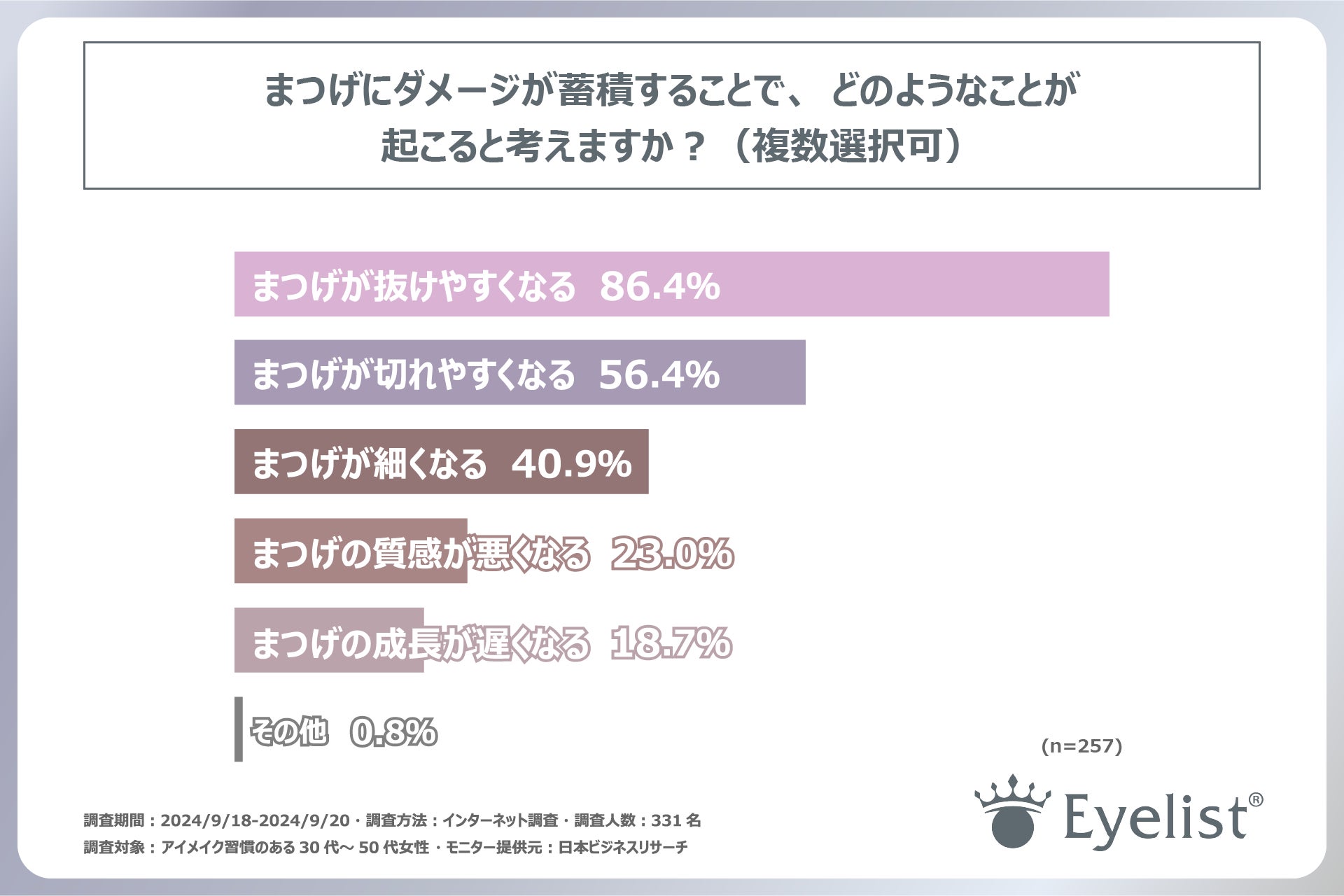 次に、アイメイクでまつげにダメージがあると回答された方に「まつげにダメージが蓄積することで、どのような影響があるか」という設問に対し、最も多かった回答は「まつげが抜けやすくなる」で86.4%でした。次いで「まつげが切れやすくなる」が56.4%、「まつげが細くなる」が40.9%と続きました。この結果から、アイメイクによるまつげへのダメージは、様々な形で影響が出ていることが明らかになりました。