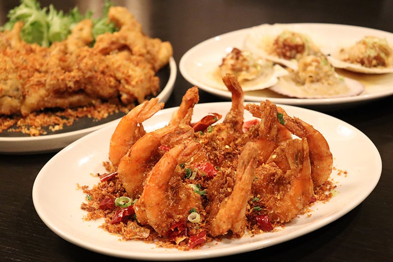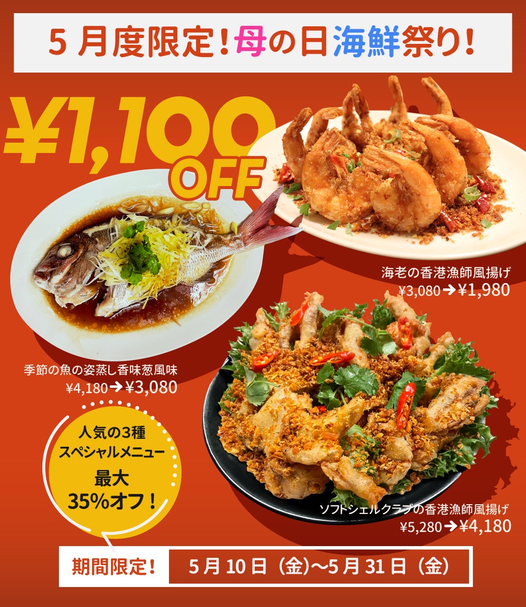 【5月10日〜5月31日】の間、海老の香港漁師風揚げ 3080円→1,980円 、季節の魚姿蒸し香味葱風味 4,180円→3,080円 、ソフトシェルクラブの香港漁師風揚げ 5,280円→4,180円