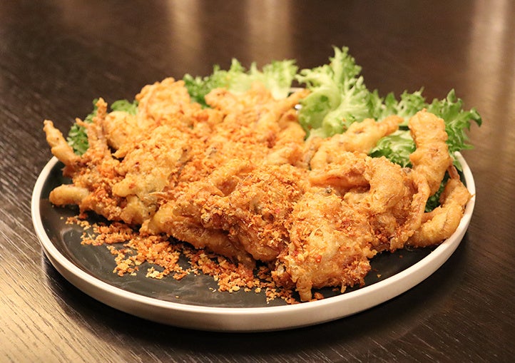 ソフトシェルクラブをパッと素揚げして、揚げにんにく、パン粉、唐辛子などでカラッと炒めました。