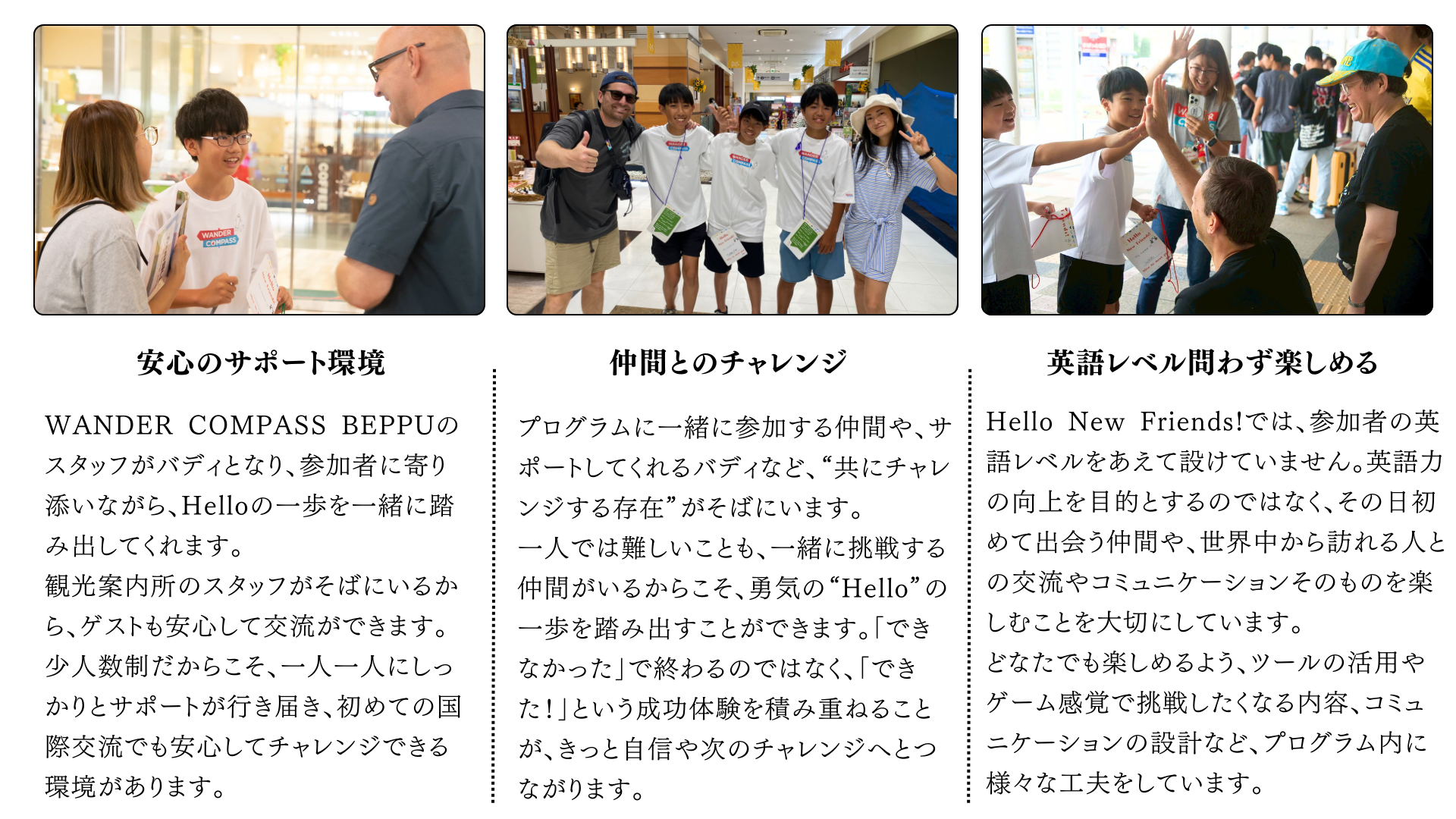 一般社団法人 別府市産業連携・協働プラットフォーム B-biz LINK(所在地:大分県別府市、代表理事:堀 景)が運営する、JR別府駅構内の交流型観光案内所「WANDER COMPASS BEPPU」は、観光案内所を舞台に世界中から訪れる外国人観光客とリアルに英語で交流できる国際交流体験プログラム「Hello New Friends! ~わくわく英語の大冒険、Helloから始まる国際交流プログラム~(以下、Hello New Friends!)」を、2026年1月12日(月・祝)よりスタートします。それに伴い、本日2025年12月18日(木)より全国から参加者の募集を開始します。