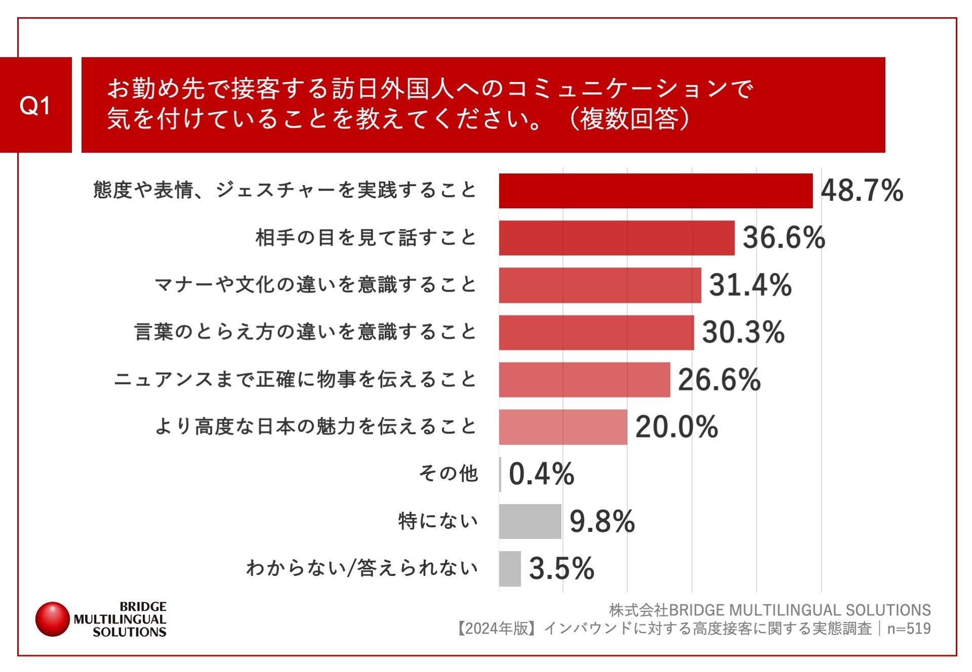 「Q1.お勤め先で接客する訪日外国人へのコミュニケーションで気を付けていることを教えてください。(複数回答)」(n=519)と質問したところ、「態度や表情、ジェスチャーを実践すること」が48.7%、「相手の目を見て話すこと」が36.6%、「マナーや文化の違いを意識すること」が31.4%という回答となりました。