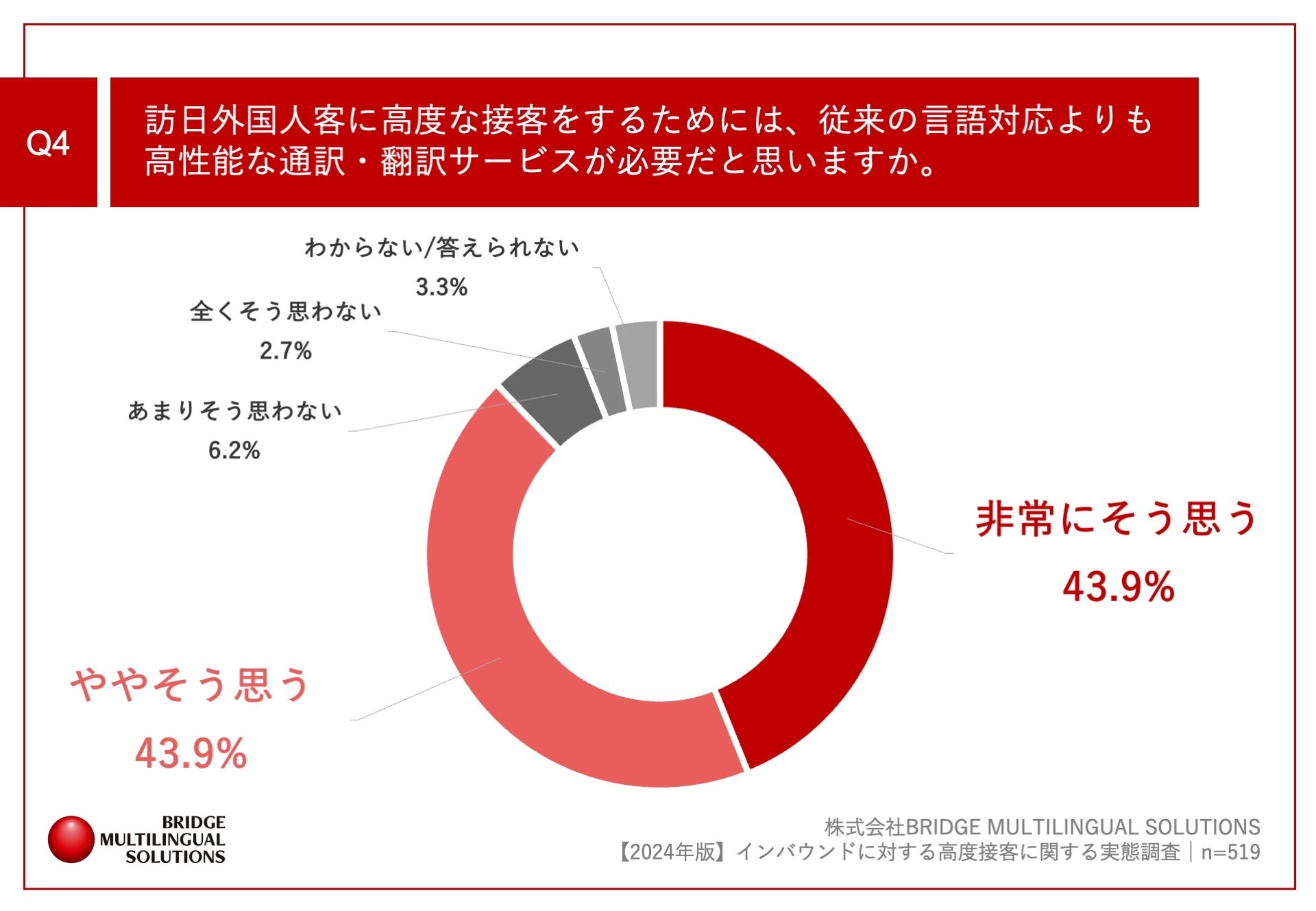 「Q4.訪日外国人客に高度な接客をするためには、従来の言語対応よりも高性能な通訳・翻訳サービスが必要だと思いますか。」(n=519)と質問したところ、「非常にそう思う」が43.9%、「ややそう思う」が43.9%という回答となりました。