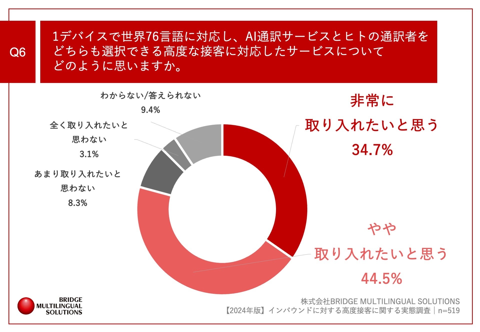 「Q6.1デバイスで世界76言語に対応し、AI通訳サービスとヒトの通訳者をどちらも選択できる高度な接客に対応したサービスについてどのように思いますか。」(n=519)と質問したところ、「非常に取り入れたいと思う」が34.7%、「やや取り入れたいと思う」が44.5%という回答となりました。