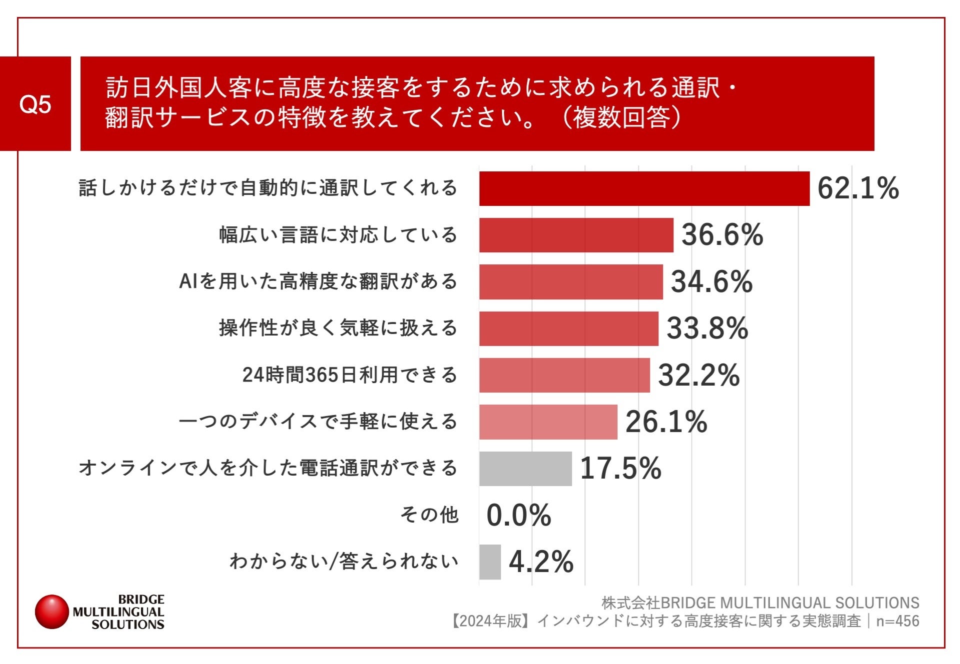 Q4で「非常にそう思う」「ややそう思う」と回答した方に、「Q5.訪日外国人客に高度な接客をするために求められる通訳・翻訳サービスの特徴を教えてください。(複数回答)」(n=456)と質問したところ、「話しかけるだけで自動的に通訳してくれる」が62.1%、「幅広い言語に対応している」が36.6%、「AIを用いた高精度な翻訳がある」が34.6%という回答となりました。