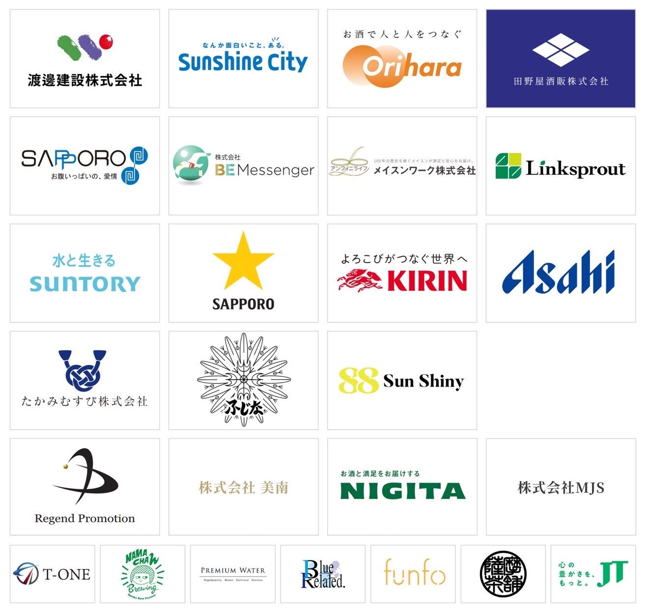 渡邉建設株式会社 / 株式会社サンシャインシティ / 株式会社折原 / 田野屋酒販株式会社 / 株式会社サッポロ実業 / 株式会社ダイレクトメッセンジャー / メイスンワーク株式会社 / 株式会社Linksprout / たかみむすび株式会社 / サントリーホールディングス株式会社 / サッポロビール株式会社 / キリンビール株式会社 / アサヒグループホールディングス株式会社 / 株式会社ふじなコーポレーション / 株式会社サンシャイニー / 株式会社レジェンドプロモーション / 株式会社美南 / 株式会社NIGITA / 株式会社MJS(順不同)