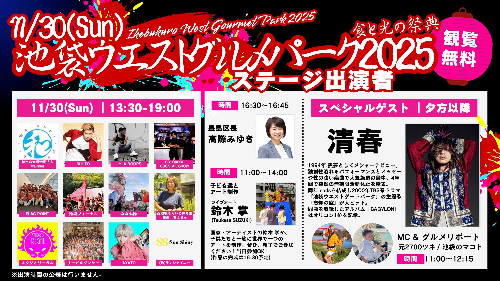清春 / 高際みゆき豊島区長 / 西池袋そらいろ保育園 園長 / 鈴木 掌 / LYLA BOOPS / COLORSOL COCKTAIL SHOW / FLAG POINT / DiA DANCE is A Heart / RED hot crew / タヒチアンダンサー ギャバン / ライカフラ / スタジオリーガル・ダンスナンバー / 池袋ヴィーナス / なな丸隊 and more...(順不同)
