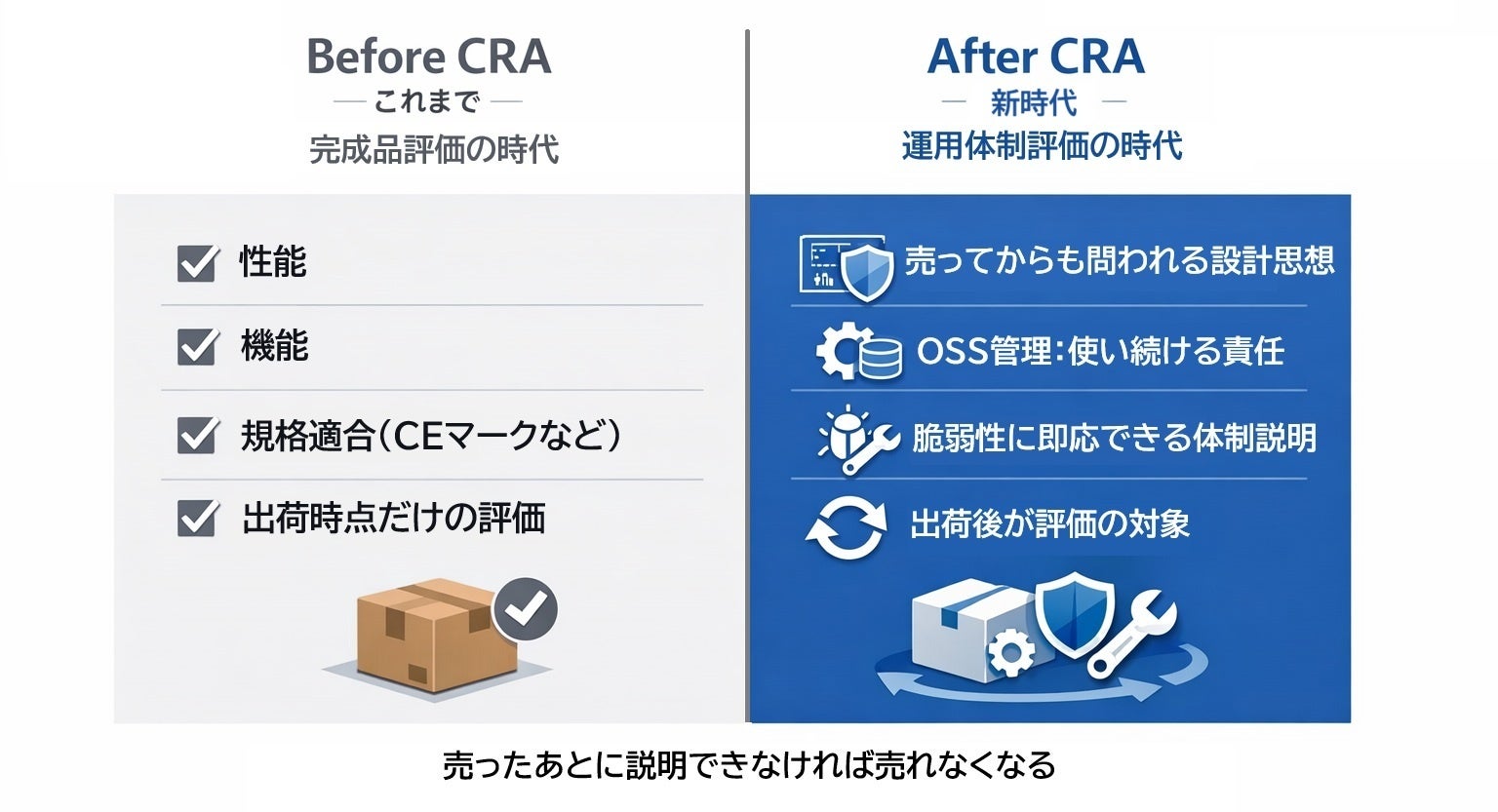 CRA は、製品そのものではなく、「売った後に何が起きた時、どう対応できる企業か」を問う規制です。