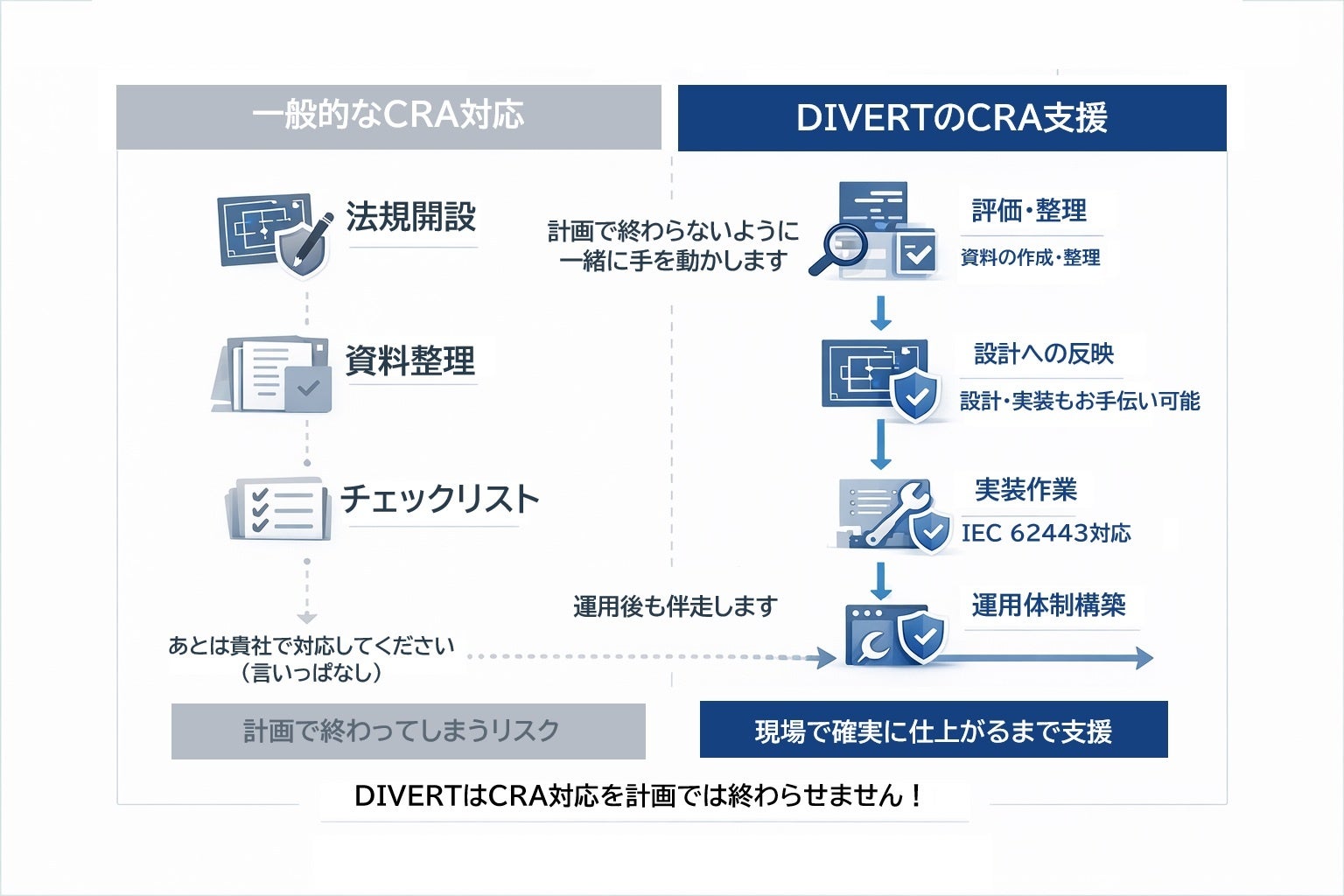 CRA 対象可否・影響範囲の整理と判定 ソフトウェア構成、OSS、設計方針の確認と技術ギャップ分析 対応優先度の整理と実装ロードマップの策定 設計見直し、実装、運用体制構築への直接的関与、DIVERT の強みは、「こうすべき」と示すだけでなく、「一緒に手を動かす」点にあります。