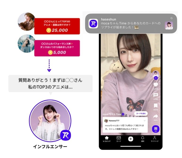 LIVE配信中に「カード」に答えた部分が自動的に切り抜かれ、ショート動画としてコンテンツ化される機能を備えており、LIVEを見逃しても、いつでも、どこでも推しのQ&Aを楽しむことが可能です。