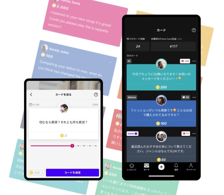 ユーザー(視聴者)は、配信者へ質問やリクエストを「カード」形式で送ることができます。配信者を応援したい方や、質問に優先的に答えてもらいたい方向けには「Prime Card」と呼ばれる課金機能があり、「カード」に対する課金額が高いほど回答優先順位を上げることができます。