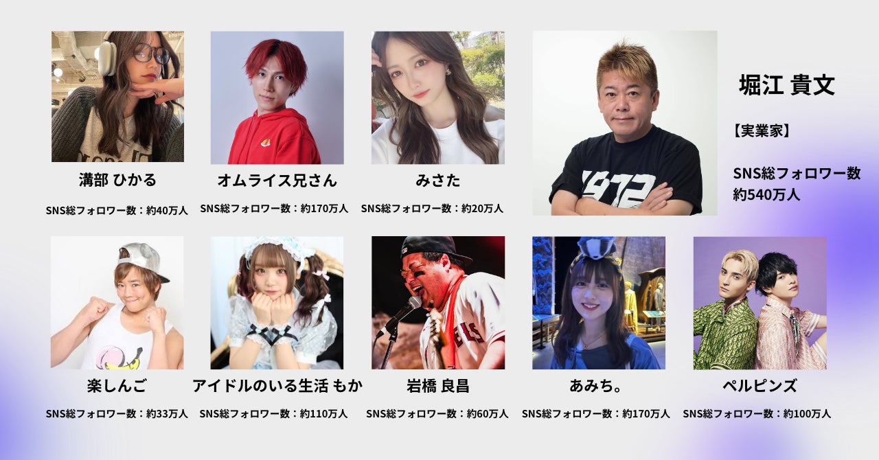 SNS総フォロワー数合計、約1億8,000万人!堀江 貴文さんやあみち。さんなど、豪華著名人の配信が確定しています。