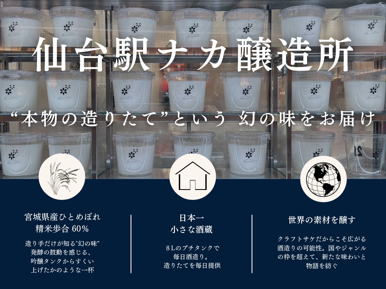 2024年夏、日本一小さな酒蔵として酒類製造免許を取得した当蔵は、仙台駅ナカで酒造りを開始しました。従来の酒蔵の規模を縮小するのではなく、自家醸造の場をスケールアップするという逆転の発想のもと設計。仙台駅1階の一角にずらりと並ぶ8Lのプチタンクで毎日仕込み、造りたてという幻の味を提供しております。