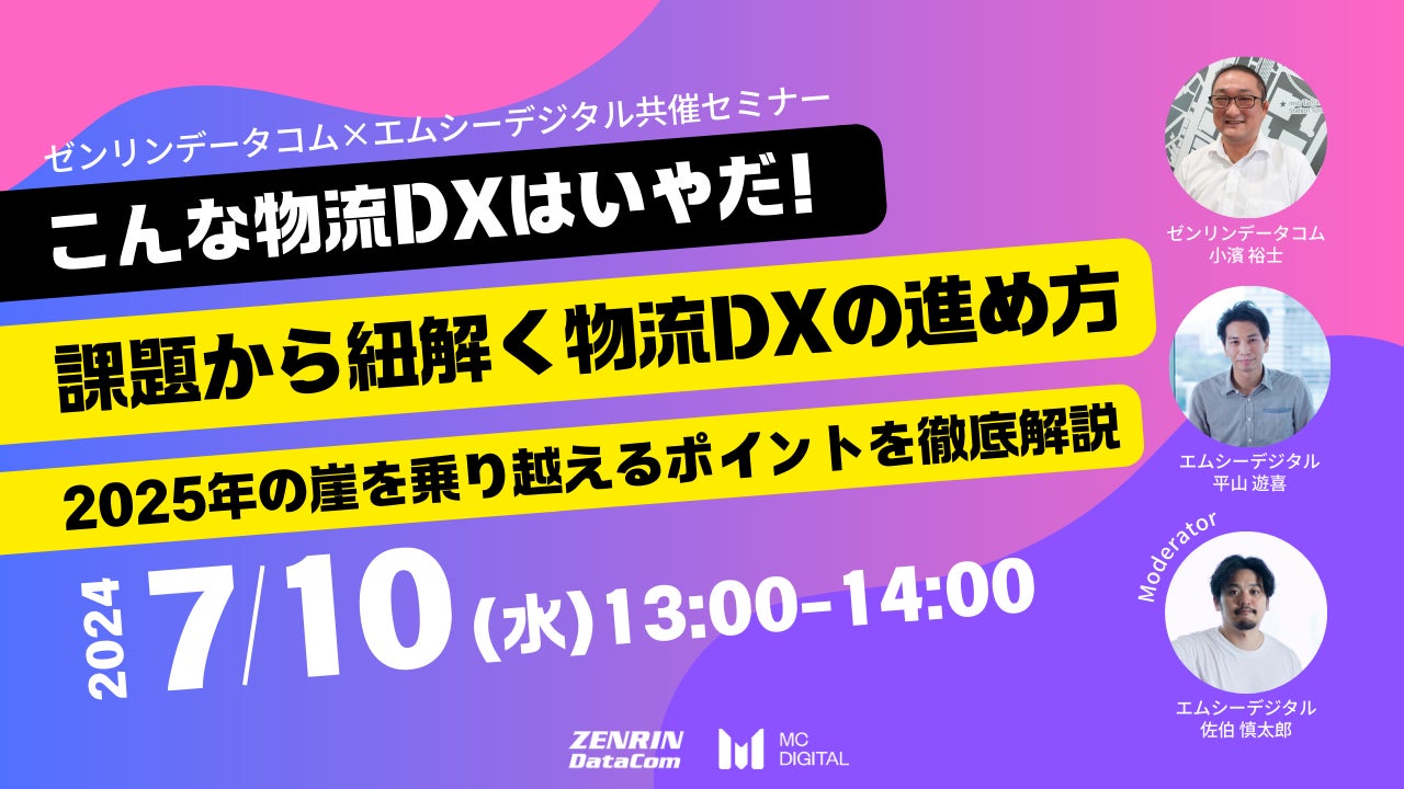 エムシーデジタル株式会社(本社:東京都千代田区、代表取締役社長:河内 伸学、以下エムシーデジタル)は、株式会社ゼンリンデータコム(本社:東京都港区、代表取締役社長:清水 辰彦、以下ゼンリンデータコム)と共催で、2024年7月10日(水)に「こんな物流DXはいやだ!課題から紐解く物流DXの進め方―2025年の崖を乗り越えるポイントを徹底解説」と題してウェビナーを開催することを決定いたしました。物流業界にも迫る2025年DXの崖をどう乗り越えていくのか、そのポイントについてディスカッション形式にて徹底解説していきます。