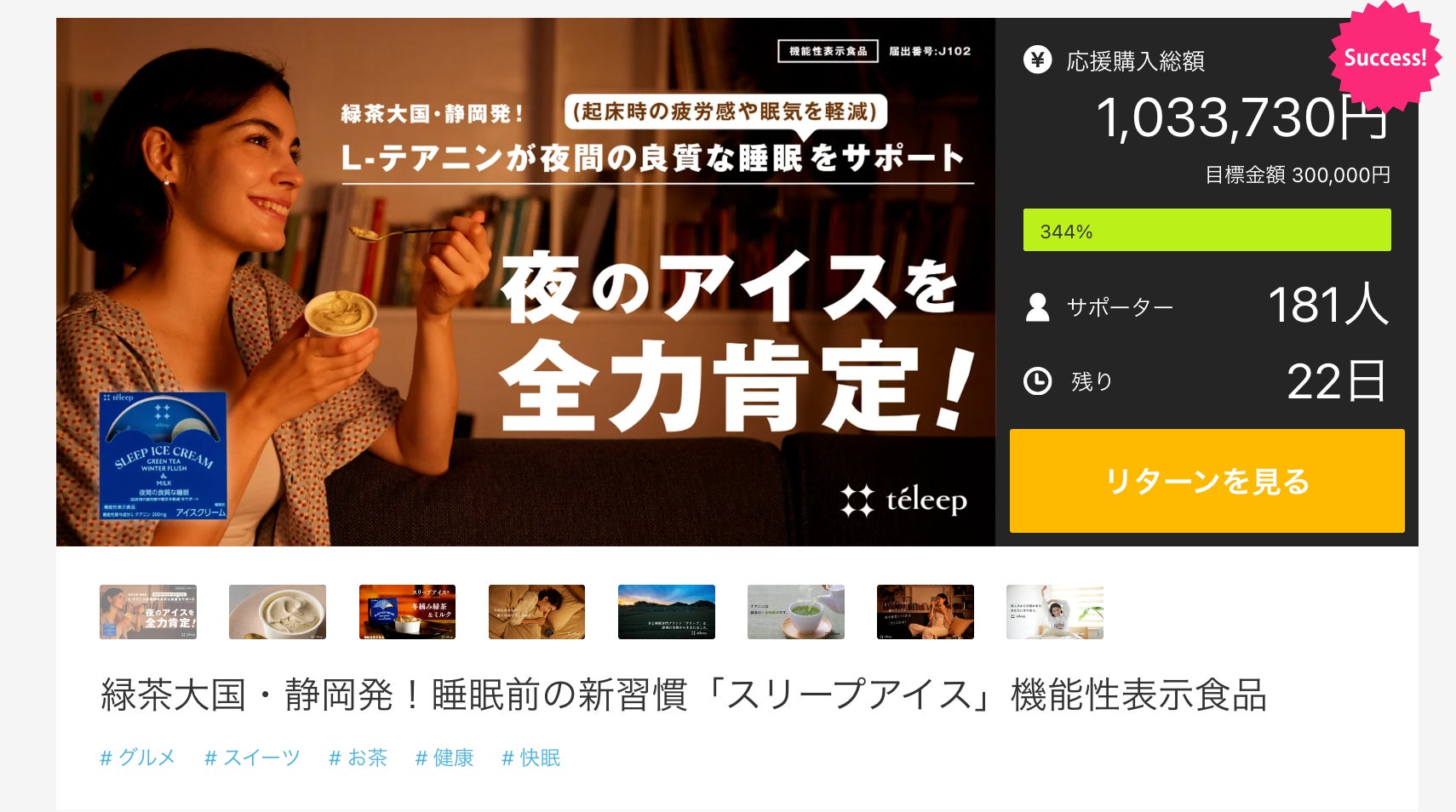 株式会社 kobachi(静岡県島田市、代表:矢田裕香)は、緑茶のうま味成分テアニンにより夜間の良質な睡眠(起床時の疲労感や眠気を軽減)をサポートする機能性表示食品『スリープアイス®冬摘み緑茶(寒茶)&ミルク』を、Makuakeにて先行発売中です。初プロジェクトにも関わらず、現在 達成率344%(総額100万円)を突破しました。
