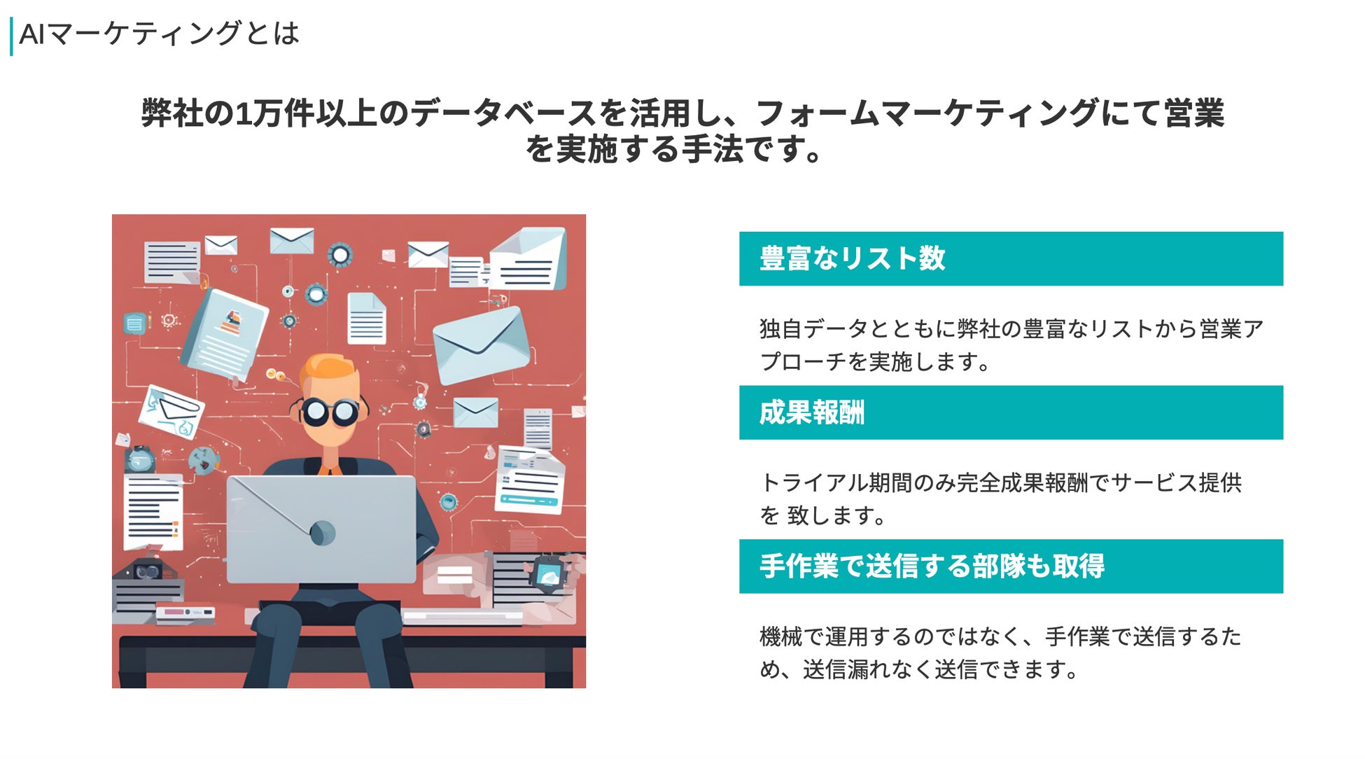 AIマーケティングは各企業に直接アプローチできるデータ7万件をもとに、成果報酬モデルで企業のアポイントを獲得していける新しい運用型のフォームマーケティングサービスです。