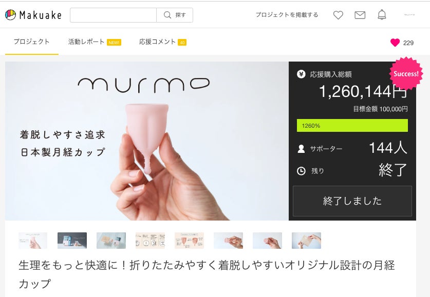 「murmo」は着脱しやすさを追求した独自設計で、月経カップの使用に踏み出せなかった方々の最初の勇気を後押しする日本製オリジナル月経カップです。Makuakeでの応援購入総額は126万円を超え、220個の商品をサポーターの皆さまへお届けいたしました。応援購入してくださったサポーターの皆さまには、この場をお借りして心より感謝申し上げます。