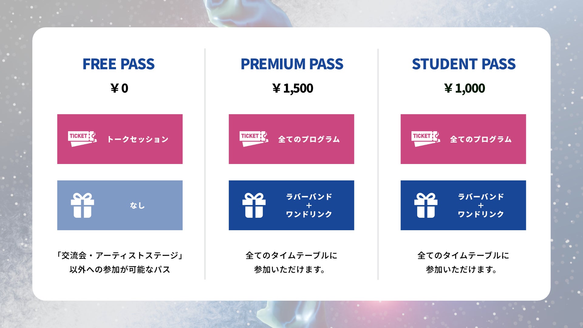 チケットの種別によって、特典の有無・参加できるタイムテーブルに制限がありますのでご注意ください。