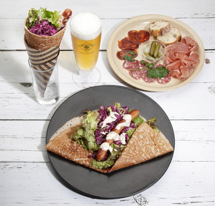 片手にビール! 片手にガレット! 粗びきソーセージと紫キャベツのマリネ、キャロットラペ、サラダ、マスタードソースのガレットです。食べやすいように巻いて提供をしてもらえます。