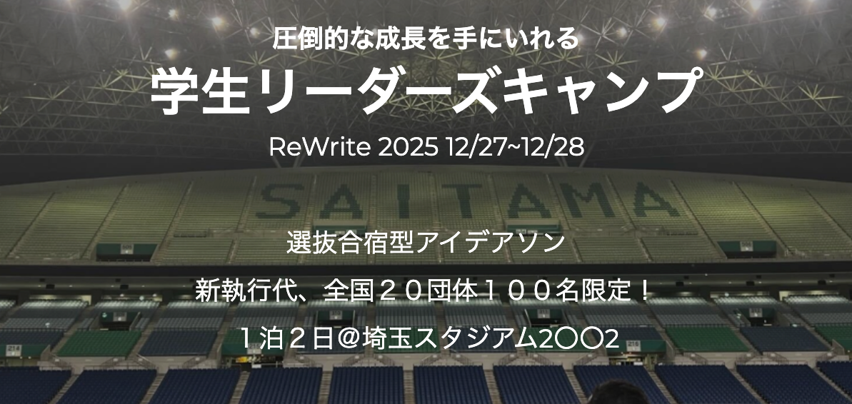 学生団体チャレンジコンテスト『ReWrite』を運営する、AYWD株式会社(エニドア)(東京都渋谷区、代表取締役CEO:笹原哲)は、令和7年12月27日・28日の2日間、埼玉スタジアム2〇〇2にて、全国の学生団体が参加する合宿型ピッチコンテスト「ReWrite2025」を開催します。本イベントは、次世代の地域創造人材や経営人材を育成する新しい教育プログラムとして、一般社団法人さいたまスポーツコミッション(さいたま市、代表理事:遠藤秀一、以下「SSC」)と埼玉スタジアム2〇〇2の協力のもと実施されます。