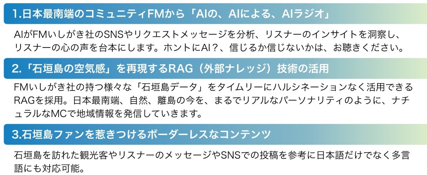 本件の注目ポイント - 日本初!?の試み: シナリオ生成からパーソナリティまで、すべてをAIが担当する次世代ラジオです 。 ※2026年2月現在の弊社とFMいしがき社との調べによります