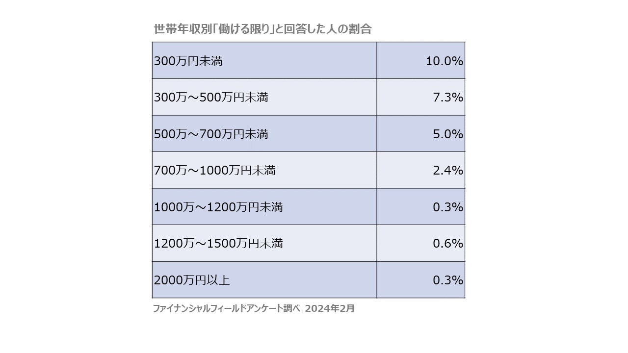 また、世帯年収別で「働ける限り働く」と回答した方の割合を見てみると、「世帯年収300万円未満」では約10%、「世帯年収2 000万円以上」では約0.3%と、世帯年収が高いほど「働ける限り働く」と考えている人が少ないという結果でした(小数点第二位は四捨五入するものとする)。