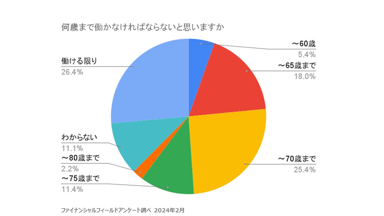 「何歳まで働かなければならないと思いますか」と質問したところ、半数以上の約69%の方が「65歳を超えても働く必要がある」と考えていることが分かりました。そのうち「働ける限り働く」と回答した方は約26.4%と、65歳で定年を迎えても可能な限り働こうと考えている方が多いという結果になりました。