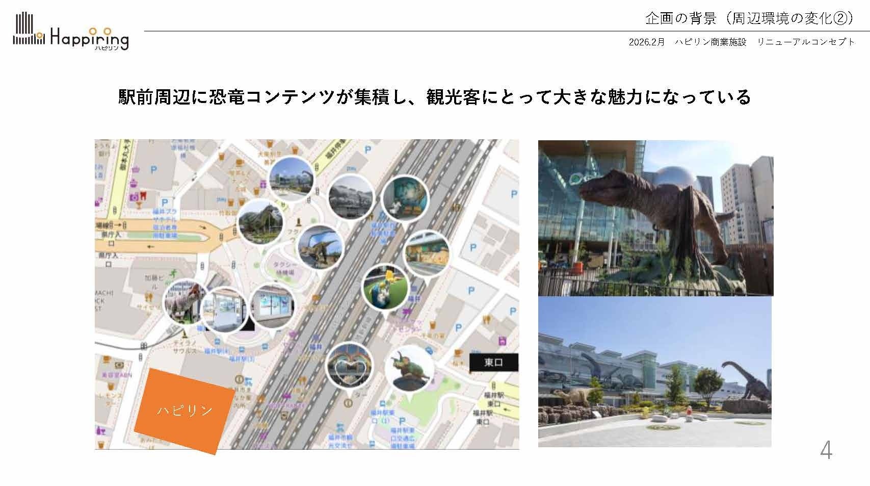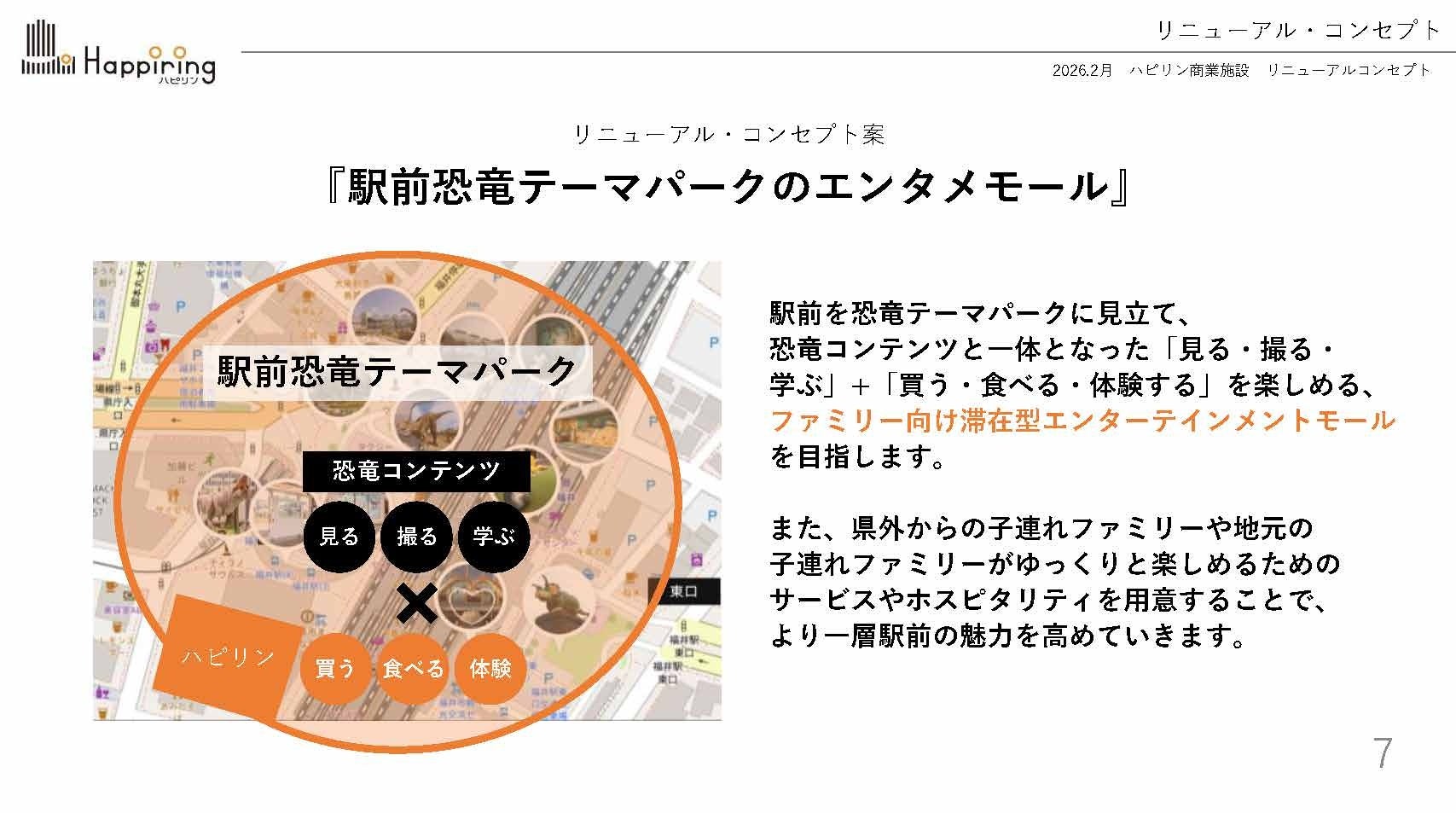 そこでハピリンモールでは、福井を代表する観光資源である”恐竜”を施設コンセプトに据え、観光客だけでなく地元のファミリー層にも楽しんでいただける商業施設へと刷新します。