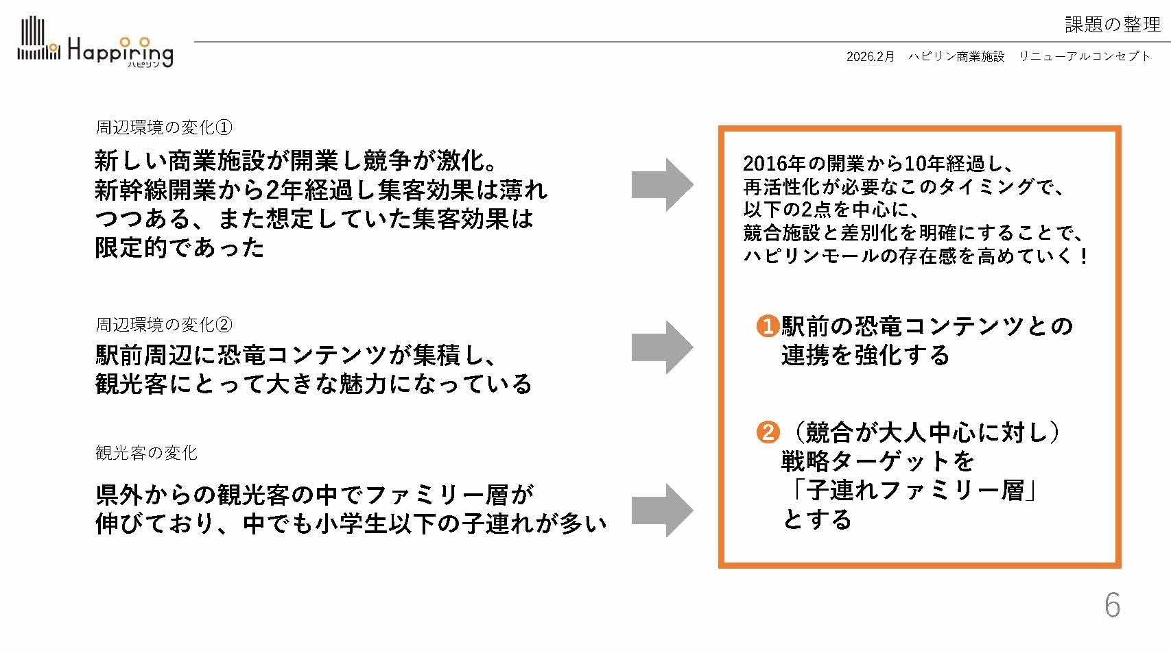 一方で、駅前では新たな商業施設の開業など環境の変化も進んでおり、来館者の回遊や消費を促す新たな魅力づくりと、来館の目的のなる明確なコンセプトづくりが求められています。
