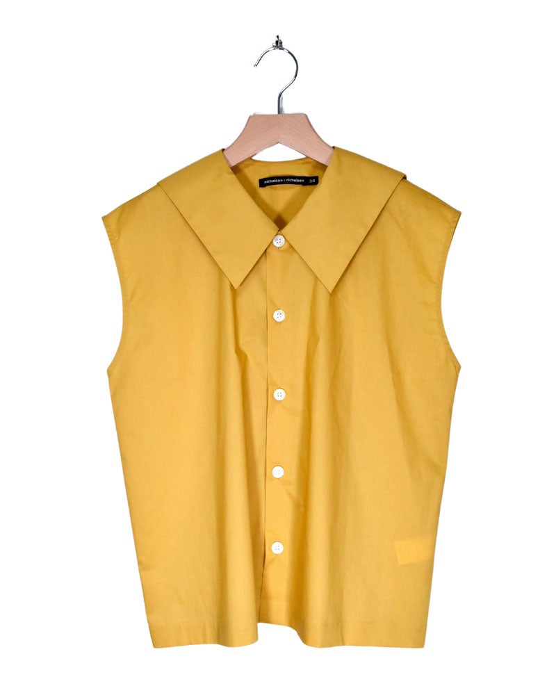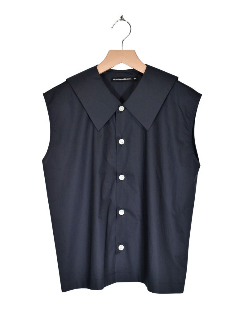 現在mielで販売中のノースリーブブラウス(ブランド:nicholson&nicholson)は、コットン100%のコンパクト糸を高密度に織り上げたポプリン生地使用。セーラーカラーが後ろ姿を可愛くみせてくれるブラウスです。上品な素材が甘くなり過ぎず、印象的な衿は、暑い季節もシンプルに着てポイントになります。