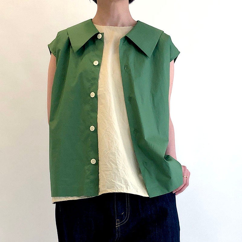 フロントボタンが前回になるので、ジレのような着こなしも可能。ニコルソンアンドニコルソンのノースリーブブラウスは、主役としても脇役としても、コーディネートのポイントとなる1枚です。
