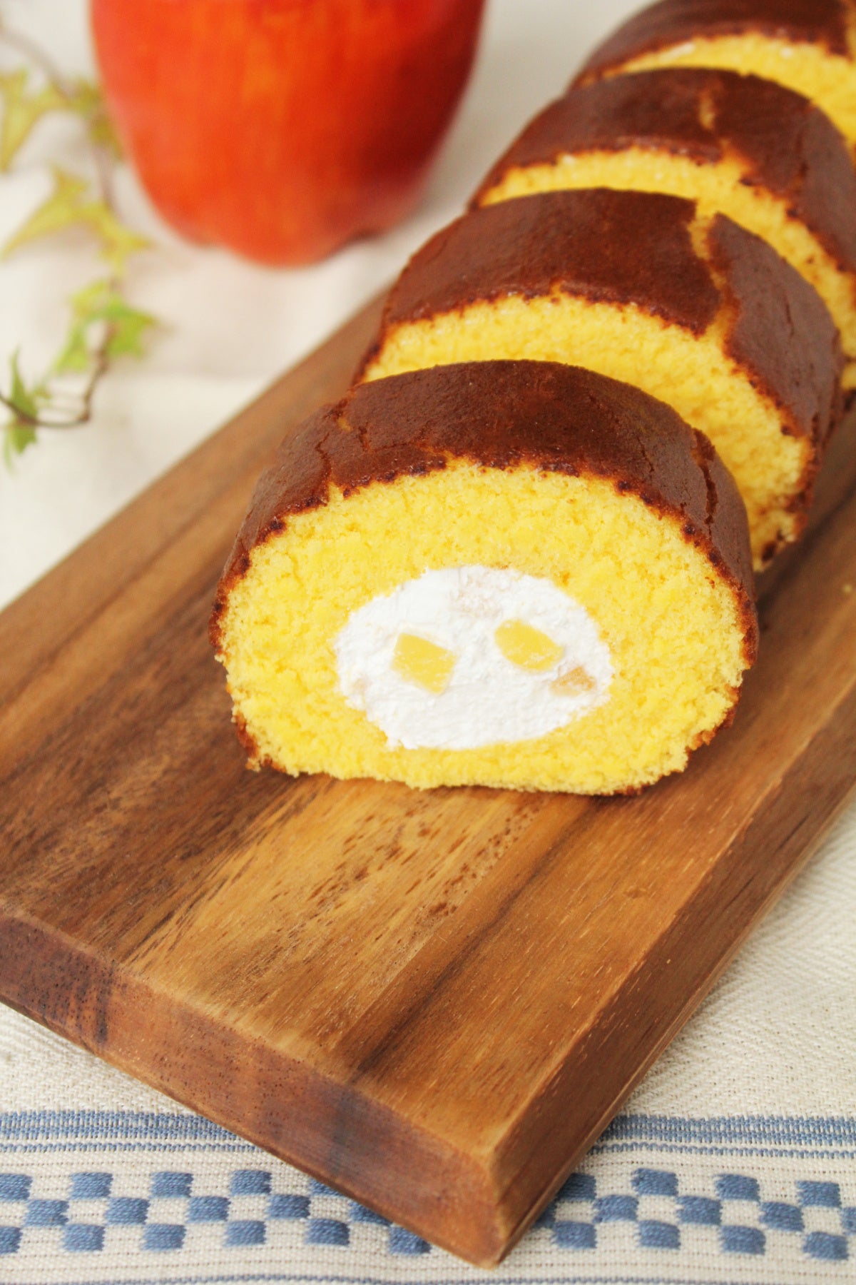 青森県産りんごダイスと、香り豊かな『X O』・りんごを原料とした『カルヴァドス』の2種類のブランデーをホイップクリームに使用し、贅沢な味わいに仕上げました。しっとりとしたカステラ生地と口どけなめらかなホイップクリーム、りんごのシャキシャキとした食感をお楽しみいただけます。