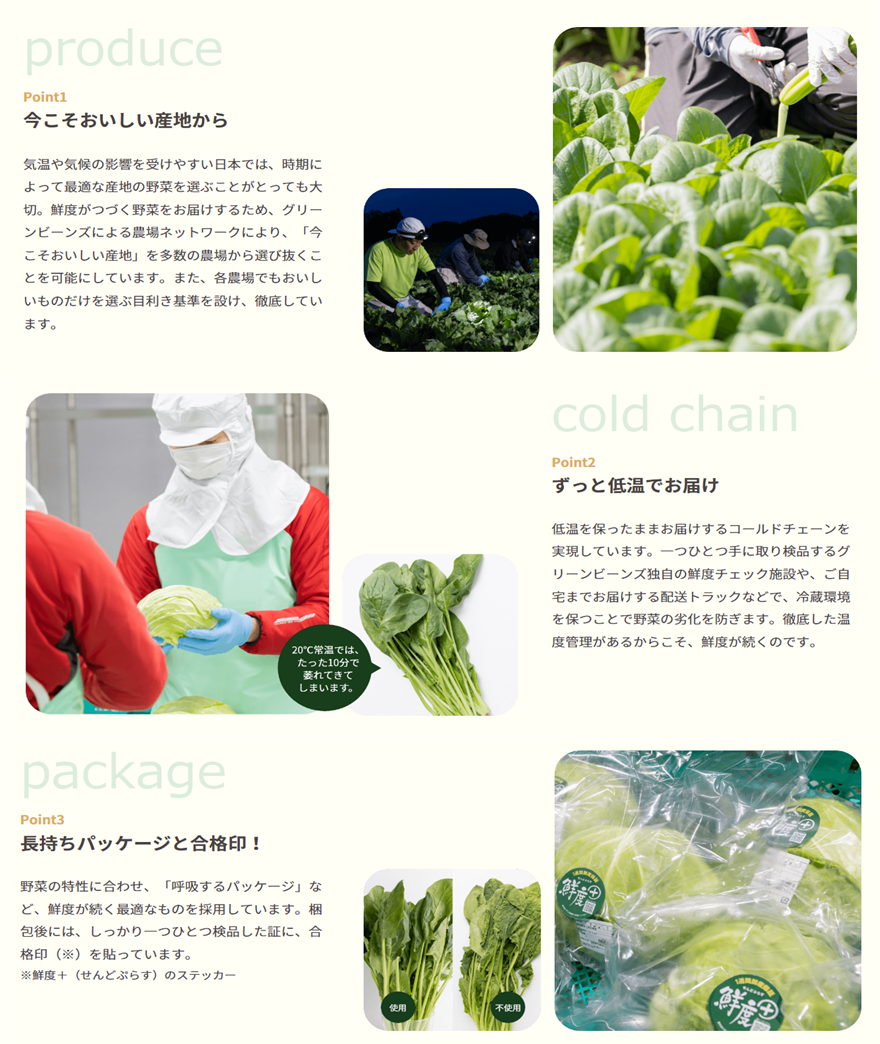 ~ 「Green Beans」だから新鮮 ~ 品質が安定しないオーガニック(有機)野菜の1週間日持ちを実現!