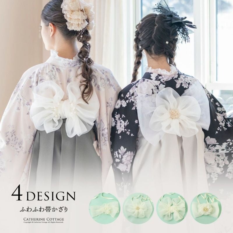 袴や着物、浴衣スタイルに華添える、シフォンやチュールで仕立てたふわふわなお花やリボンの帯飾りです。