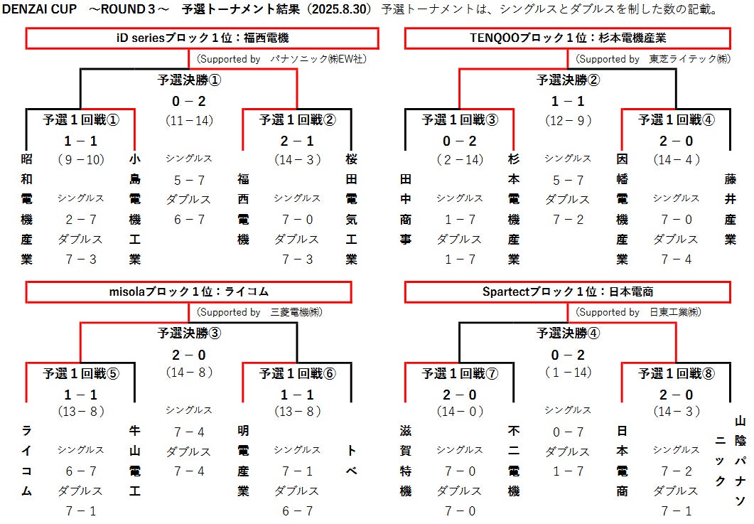 今大会の予選ブロック名は、協賛メーカーの電材商材名を取り入れたネーミングライツを採用。Spartectブロック(Supported by 日東工業㈱))では、1回戦、滋賀特機株式会社(滋賀県大津市。滋賀電設資材卸業協同組合)が、3大会連続出場の不二電機株式会社(大阪府大阪市平野区。大阪府電設資材卸業協同組合)を1ROUNDも落とさずに完全勝利の大記録を達成。しかし、その滋賀特機をも圧倒したのが日本電商。予選決勝は滋賀特機相手に、1ROUNDを落としただけの驚異的な強さを見せつけて勝利を収めた。その他、iD seriesブロック(Supported by パナソニック㈱EW社)は、初代王者の福西電機株式会社(大阪府大阪市北区。大阪府電設資材卸業協同組合)、TENQOOブロック(Supported by 東芝ライテック㈱)は、第1回大会3位の杉本電機産業株式会社(神奈川県川崎市。神奈川県電設資材卸業協同組合)、misolaブロック(Supported by 三菱電機㈱)は、第2回大会に続き、株式会社ライコム(神奈川県横浜市。神奈川県電設資材卸業協同組合)がそれぞれ予選優勝を果たした。
