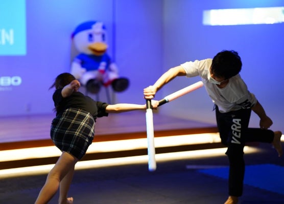 次世代のデジタルチャンバラのようなスポーツで、試合で使用するセンサー内蔵のLED刀は、Bluetoothで専用アプリと連動し、どちらが先に当てたのかを機械判定。スマートフォン一台と刀2本あれば、どこでも遊べます。