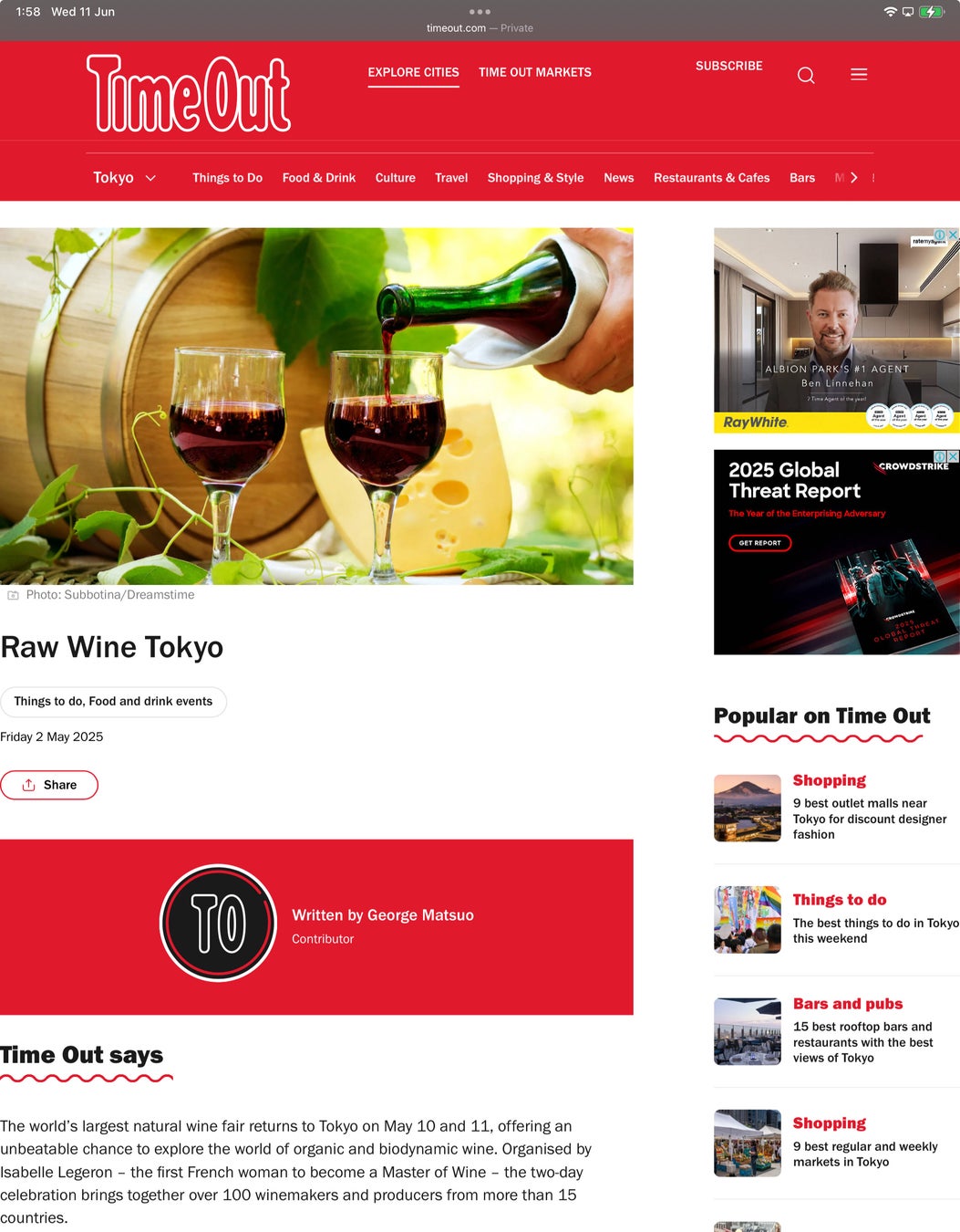 「Things to do in Tokyo(東京の楽しみ方)」の企画内にて、RAW WINE TOKYO 2025のイベント告知記事が紹介されました。(英語記事)