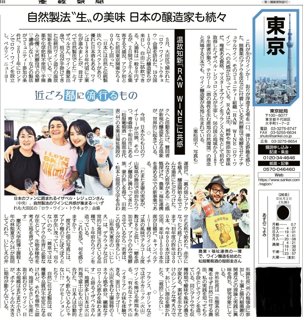 人気シリーズ「近ごろ都に流行るもの」にて、日本ワインや火山ワインなどのトピックも織り交ぜながら「RAW WINE」イベントについてを解説。令和7年(2025年)6月25日朝刊。