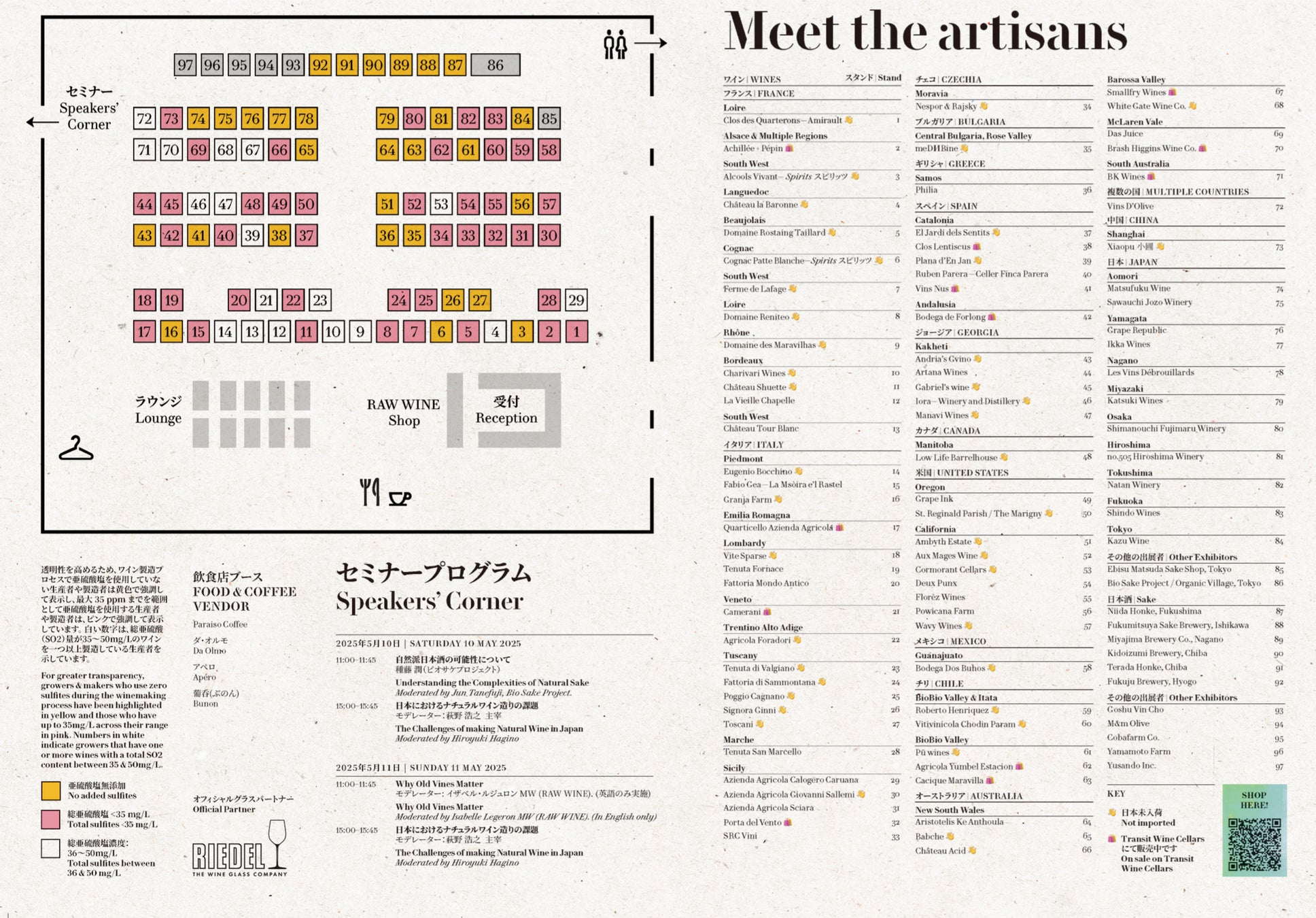 効率よく充実した試飲体験をしたいなら、まずは会場マップのチェックが必須です。出店者のレイアウトは国別で、また酸化防止剤無添加や使用量別も入念に色分けされているので、それらを目安に気になる国や目当てのワイナリーなど、自分好みの目星をつけて優先的に回るのが良さそう。もしくは北の国や南の国、ワイン生産地としては珍しい国、など気分でテーマを見つけても楽しいはず。また、事前に公式ホームページで出店生産者の情報が掲載されているので、事前にチェックしておけばよりスムーズにテイスティングを満喫できるはずです。