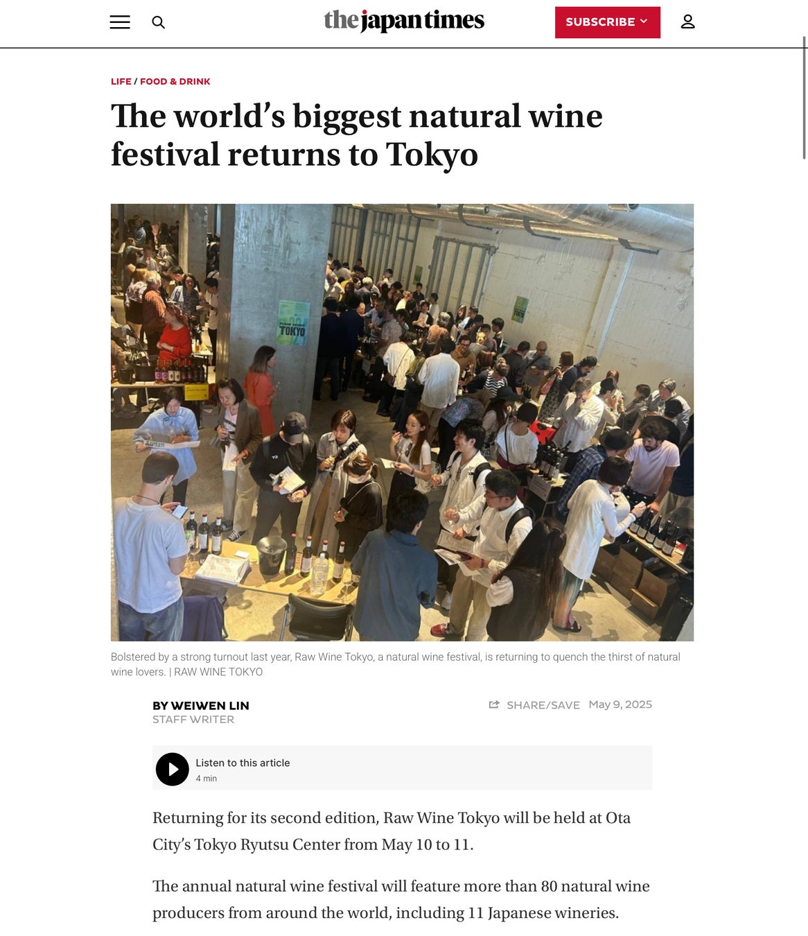RAW WINE TOKYOの人気の秘密や、2回目となる今年のイベントの見どころをおさえた告知が紹介されています。(英語記事)