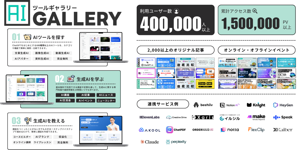 ■ AIツールギャラリー:600以上のAIツールの使い方を初心者向けに紹介するAIメディア。累計50万名以上、150万PV以上を達成