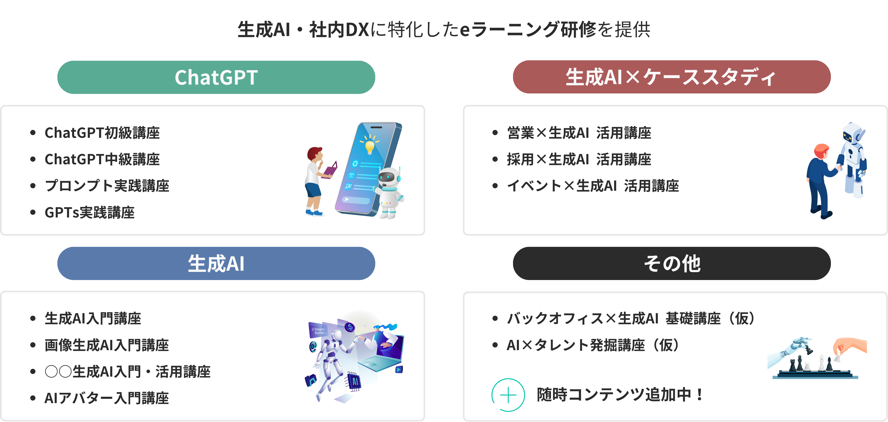 当社は生成AI分野において豊富な実績を有しており、特に教育・研修分野での専門性に強みを持っています。
